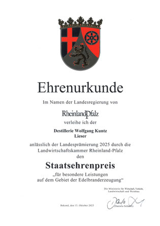 Als Krönung unseres 30 jährigen Betriebsbestehens haben wir aufgrund unserer Betriebsleistung den Staatsehrenpreis des Landes Rheinland-Pfalz verliehen bekommen und und on Top gab es noch den Ehrenpreis für den Siegerbrand in der Kategorie Kernobst.